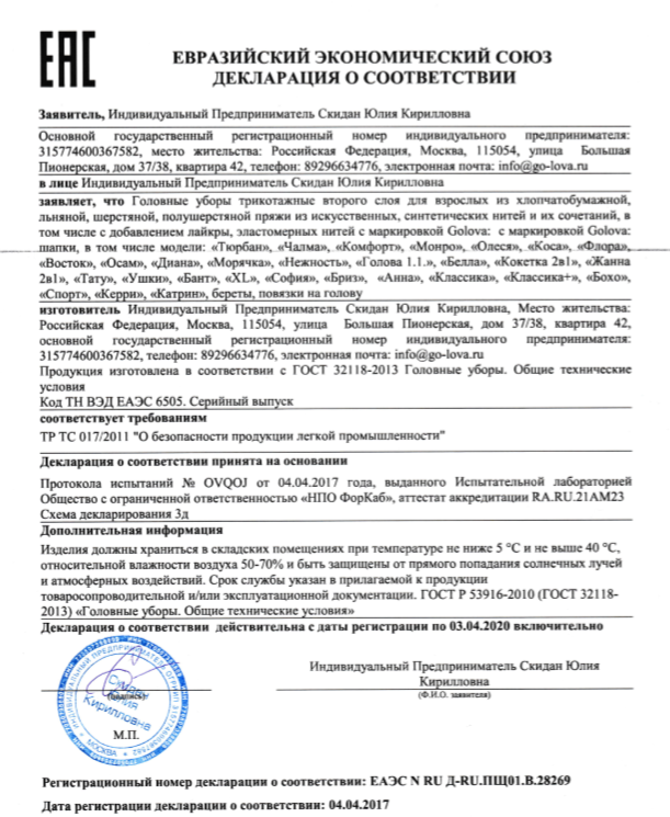 Все наши головные уборы прошли процедуру декларирования с тестированием моделей на соответсвие критериям качества Таможенного союза!